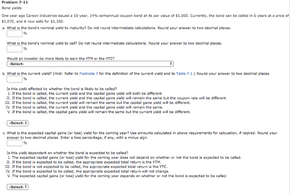 Investments Final Flashcards | Quizlet Consider a bond paying a coupon rate of 10% per year semi-annually when the market rate of interest is 8.5% per year. The bond has three years until maturity. Calculate the bond's price today. 1,000 FV, 50 PMT, 6 N, 4.25 I/Y CPT PV = 1,038.99805 Price = $1,039.00 YTM- Zero Coupon Bond OneClass: Consider a bond paying a coupon rate of 10% per year ... Consider a bond paying a coupon rate of 10% per year semiannually when the market interest rate is only 4% per half-year. The bond has three years until maturity. a. Find the bond's price today and six months from now after the next coupon is paid. (Do not round intermediate calculations. Round your answers to 2 decimal places.)
