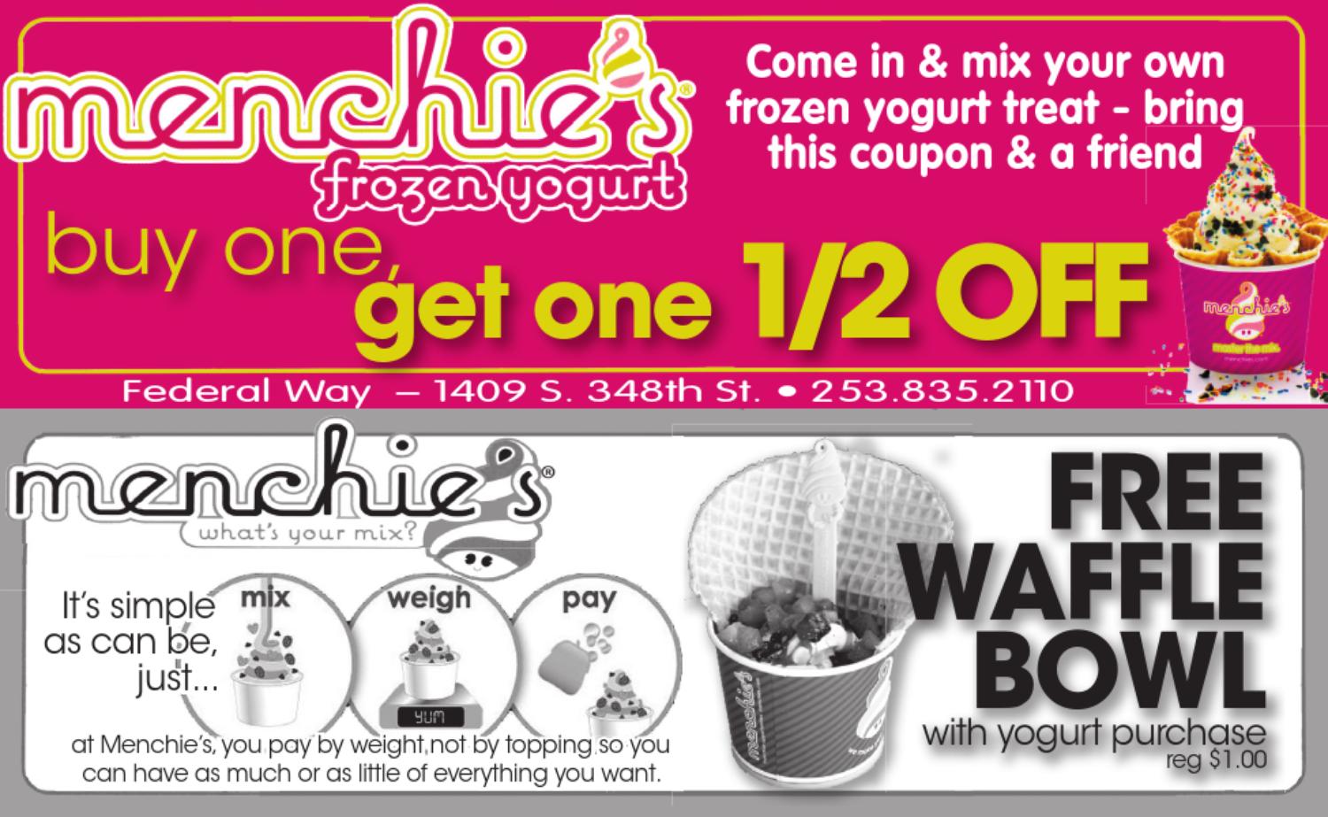 FREE Frozen Yogurt at Menchie's! - Printable Coupons and Deals Keep in mind that this offer is only valid for the first 50 people to each store. Head to Menchie's stores on 2/14 and score a FREE 5 oz frozen yogurt - including toppings! Limit one per person starting at 3:00PM and limited to the first 50 guests. Mark your calendar for this great deal. No coupon is required. Menchie's Frozen Yogurt - FAQs & Contact: Frozen Yogurt: Yogurt Shop ... The birthday reward gives registered guests a yearly $5 coupon to use 1 week before to 1 week after their birthday. The coupon can only be used on a singular transaction and is automatically attached to your mySmileage account. To check if you have a birthday reward, please visit here. I have multiple accounts. Menchie's Frozen Yogurt: Frozen Yogurt: Frozen Yoghurt: Yogurt Shop ... Our new flavor is cinn-fully delicious! Head to Menchie's today to try our Vegan Cinnamon Horchata made with Almond Milk flavor! It's sweet, creamy, and entirely plant-based, and it's made with no artificial flavors, no artificial colors, and no high-fructose corn syrup! If you're looking for a sweet vegan dessert, this flavor is for you!