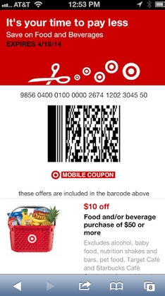 Target Mobile Coupon: $10 off $50 Grocery & Beverage Purchase There is a HOT new Target mobile coupon available. Just text FOOD to 827438 and you'll receive a $10 off your food or beverage purchase of $50 or more coupon (coupon valid beginning 5/18)! Combine this coupon with other manufacturer and Target Cartwheel coupons and you should be able to get some nice deals on natural and organic food.